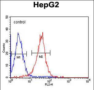 ALDH2 Monoclonal Antibody (Cat. #P32621) flow cytometric analysis of HepG2 cells (right histogram) compared to a negative control cell (left histogram).PE-conjugated goat-anti-mouse secondary antibodies were used for the analysis. |