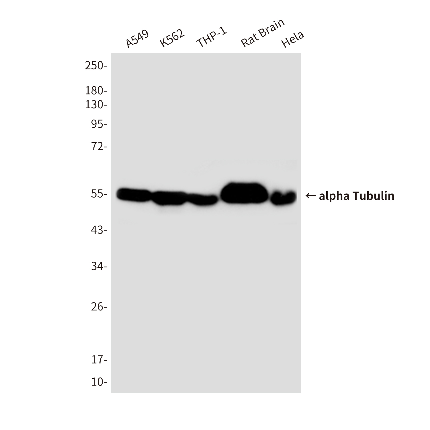 Western blot analysis of alpha Tubulin in A549, K562, THP-1, rat Brain, Hela lysates using alpha Tubulin antibody. |