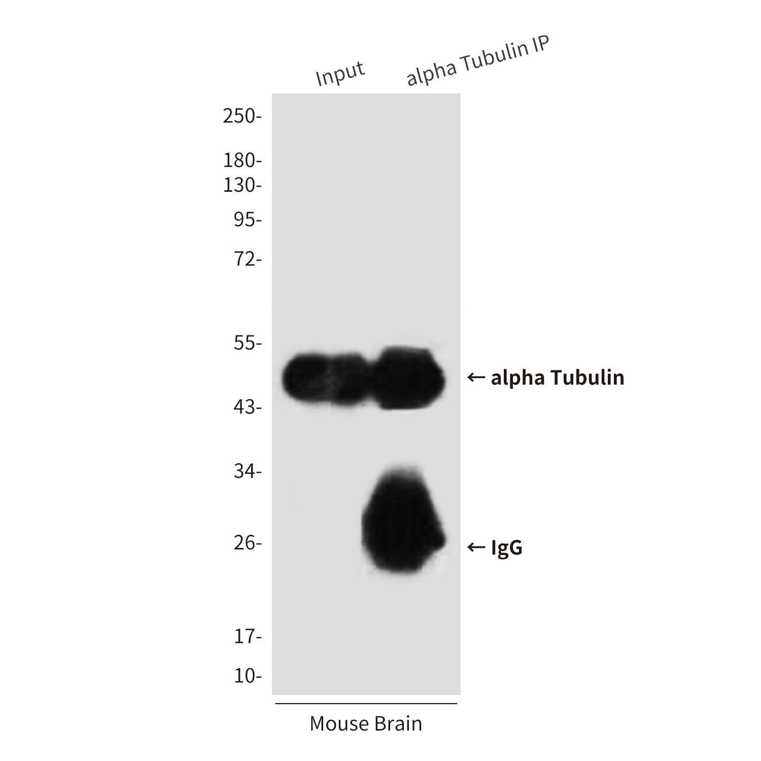 Immunoprecipitation analysis of alpha Tubulin in mouse Brain Tissue lysates using alpha Tubulin antibody. |