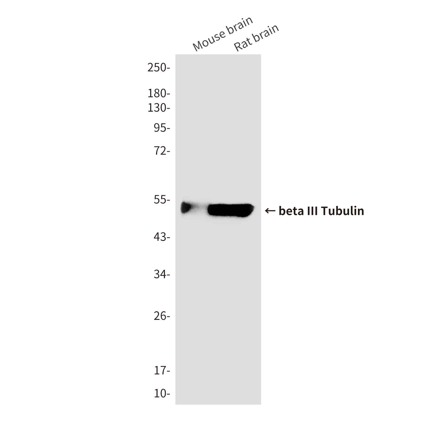 Western blot analysis of beta III Tubulin in mouse brain, rat brain lysates using beta III Tubulin antibody. |