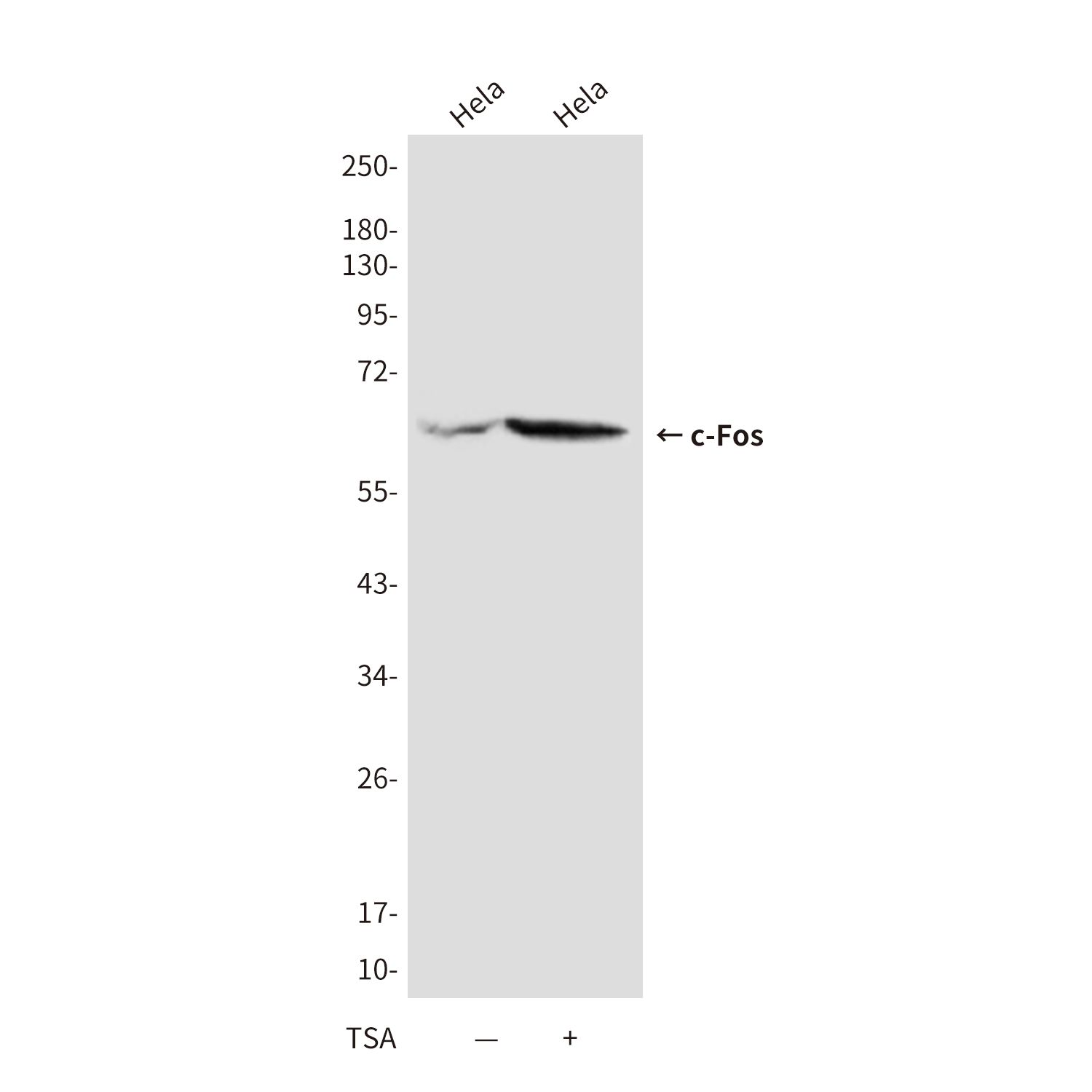 Western blot analysis of c-Fos in Hela(TSA treated ) and Hela lysates using c-Fos antibody. |