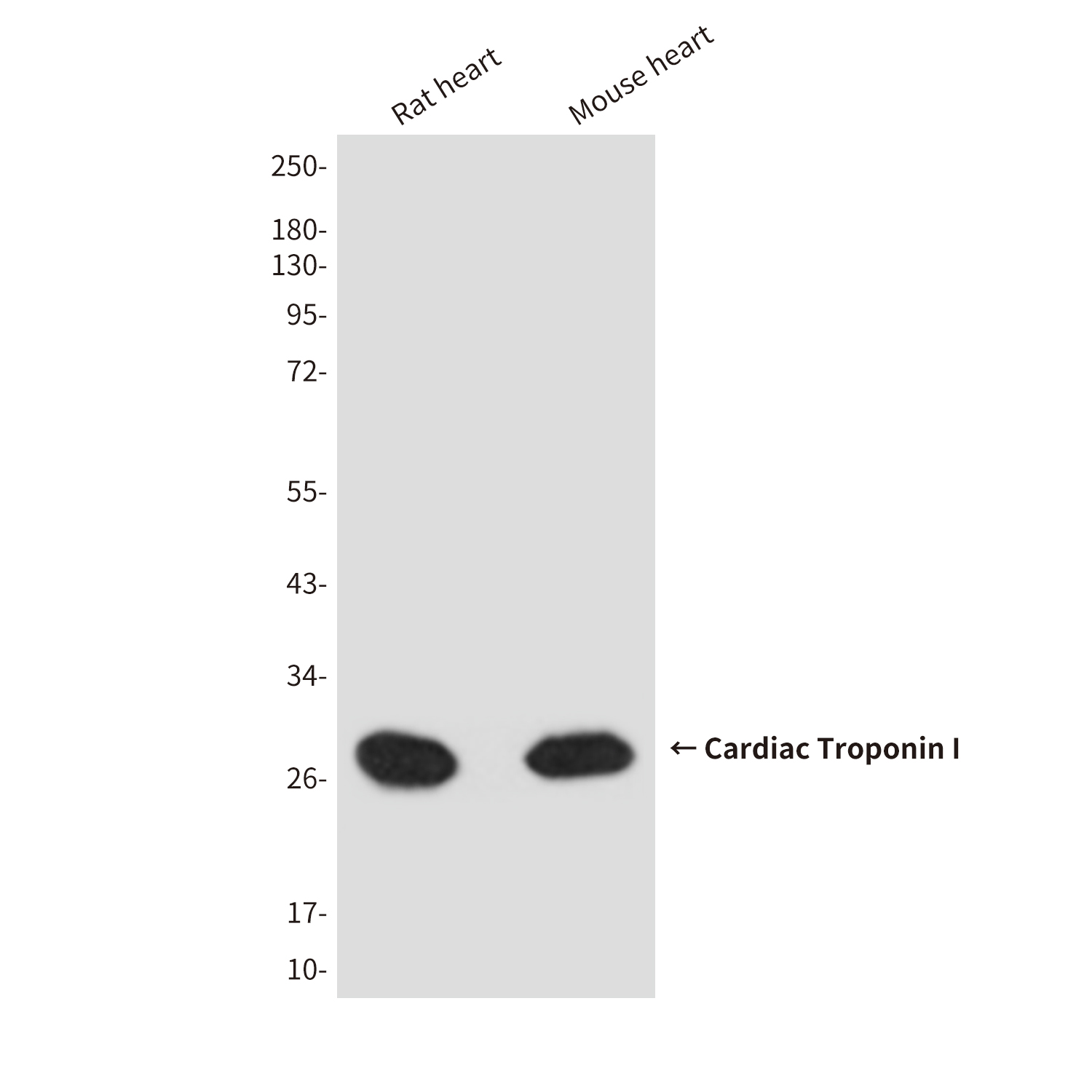 Western blot analysis of Cardiac Troponin I in rat and mouse heart lysates using Troponin I antibody. |