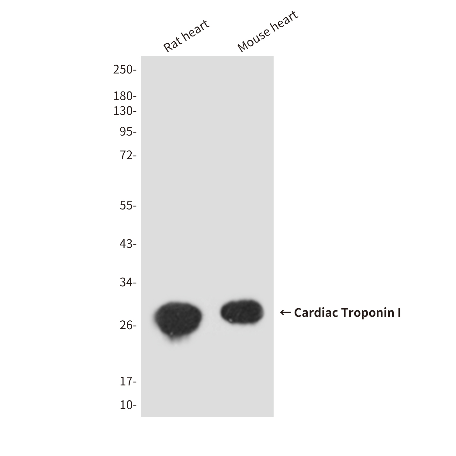 Western blot analysis of Cardiac Troponin I in rat and mouse heart lysates using Cardiac Troponin I antibody |