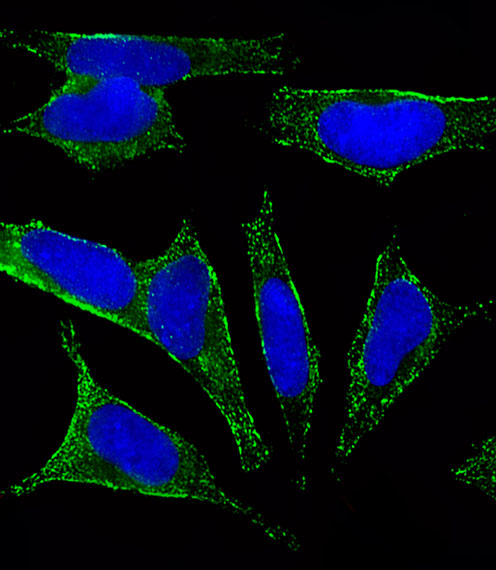 Fluorescent image of SH-SY5Y cells stained with CHRM2 Antibody (Cat#P32873 ). P32873 was diluted at 1:25 dilution. An Alexa Fluor® 488-conjugated goat anti-mouse lgG at 1:400 dilution was used as the secondary antibody (green). DAPI was used to stain the cell nuclear (blue). |