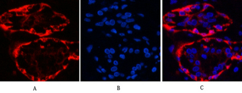 Immunofluorescence analysis of Cytokeratin 17 in Human breast tissue using CK17 antibody(red),and DAPI (blue). |