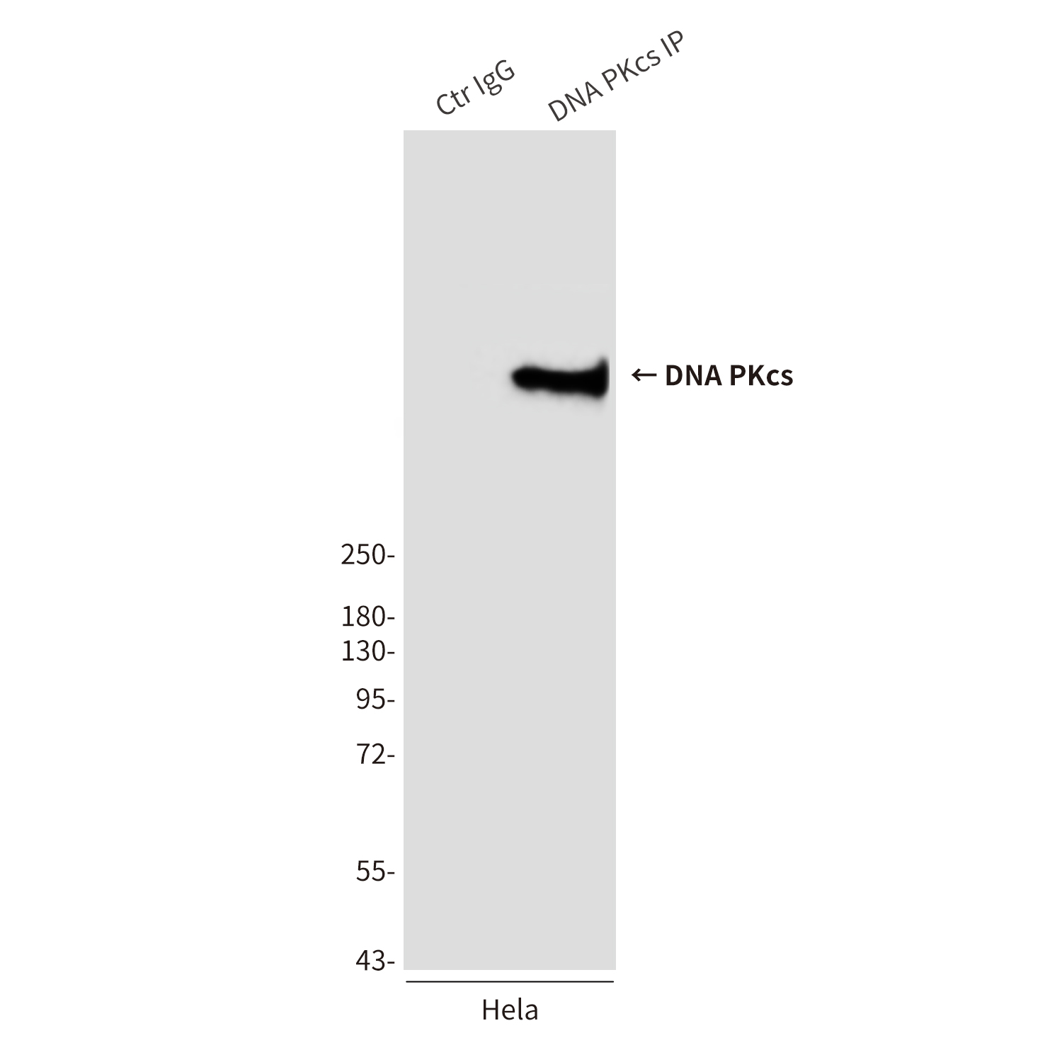 Immunoprecipitation analysis of DNA PKcs in Hela lysates using DNAPKcs antibody. |