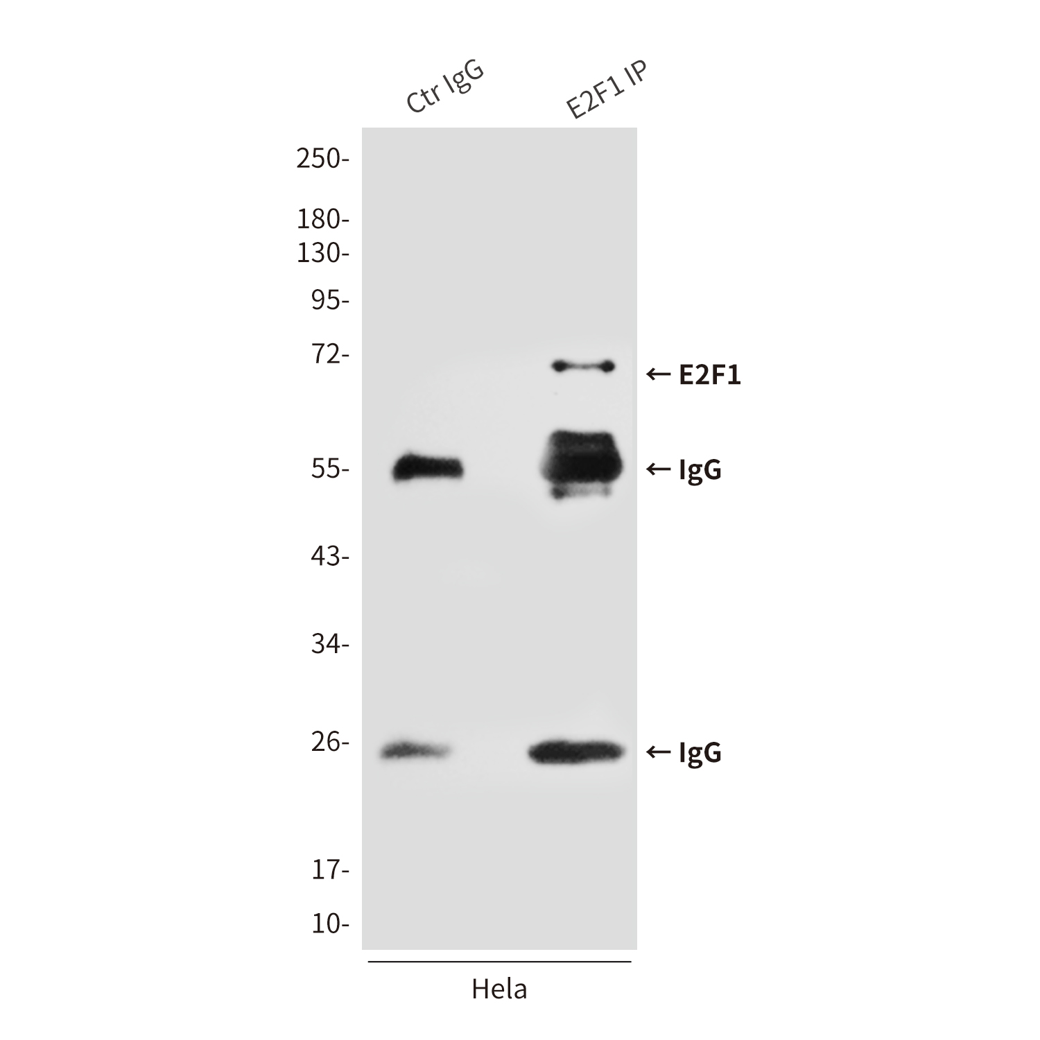 Immunoprecipitation analysis of E2F1 in Hela lysates using E2F1 antibody. |
