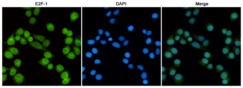 Immunofluorescence analysis of E2F1 in Hela using E2F1 antibody,and DAPI (blue). |