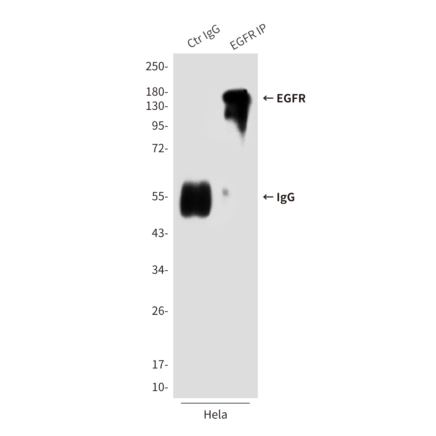 Immunoprecipitation analysis of EGFR in Hela lysates using EGFR antibody. |