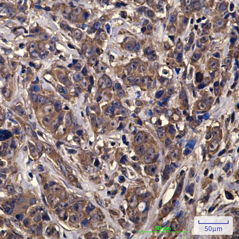 Immunohistochemistry analysis of paraffin-embedded Human breast cancer tissue using eIF4A1 antibody.High-pressure and temperature Sodium Citrate pH 6.0 was used for antigen retrieval. |