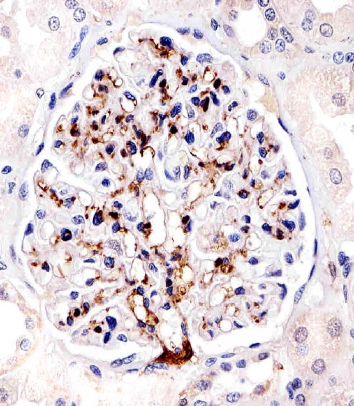 Immunohistochemical analysis of paraffin-embedded H. kidney section using FABP4 Antibody(Cat#P32531). P32531 was diluted at 1:25 dilution. A undiluted biotinylated goat polyvalent antibody was used as the secondary, followed by DAB staining. |