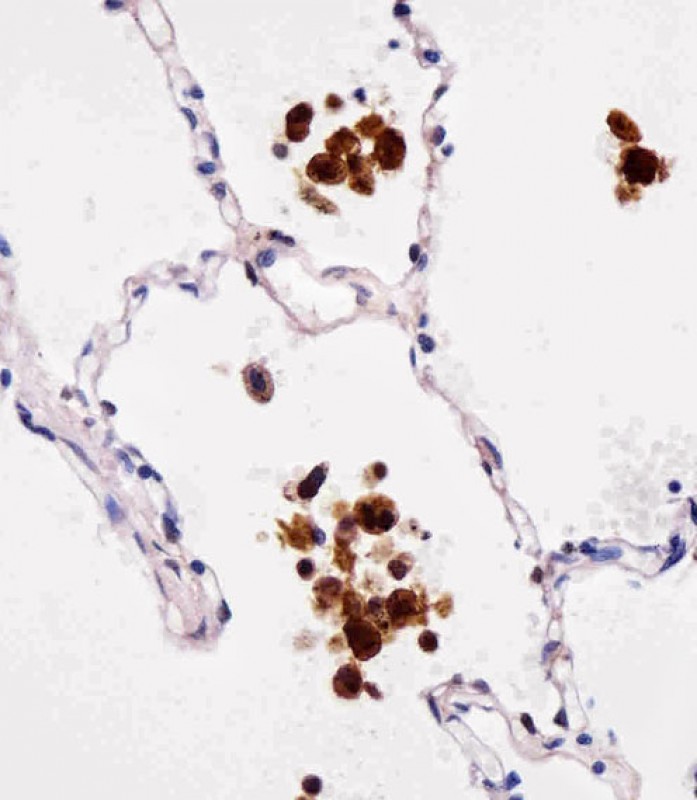 Immunohistochemical analysis of paraffin-embedded H. lung section using FABP4 Antibody(Cat#P32531). P32531 was diluted at 1:25 dilution. A undiluted biotinylated goat polyvalent antibody was used as the secondary, followed by DAB staining. |