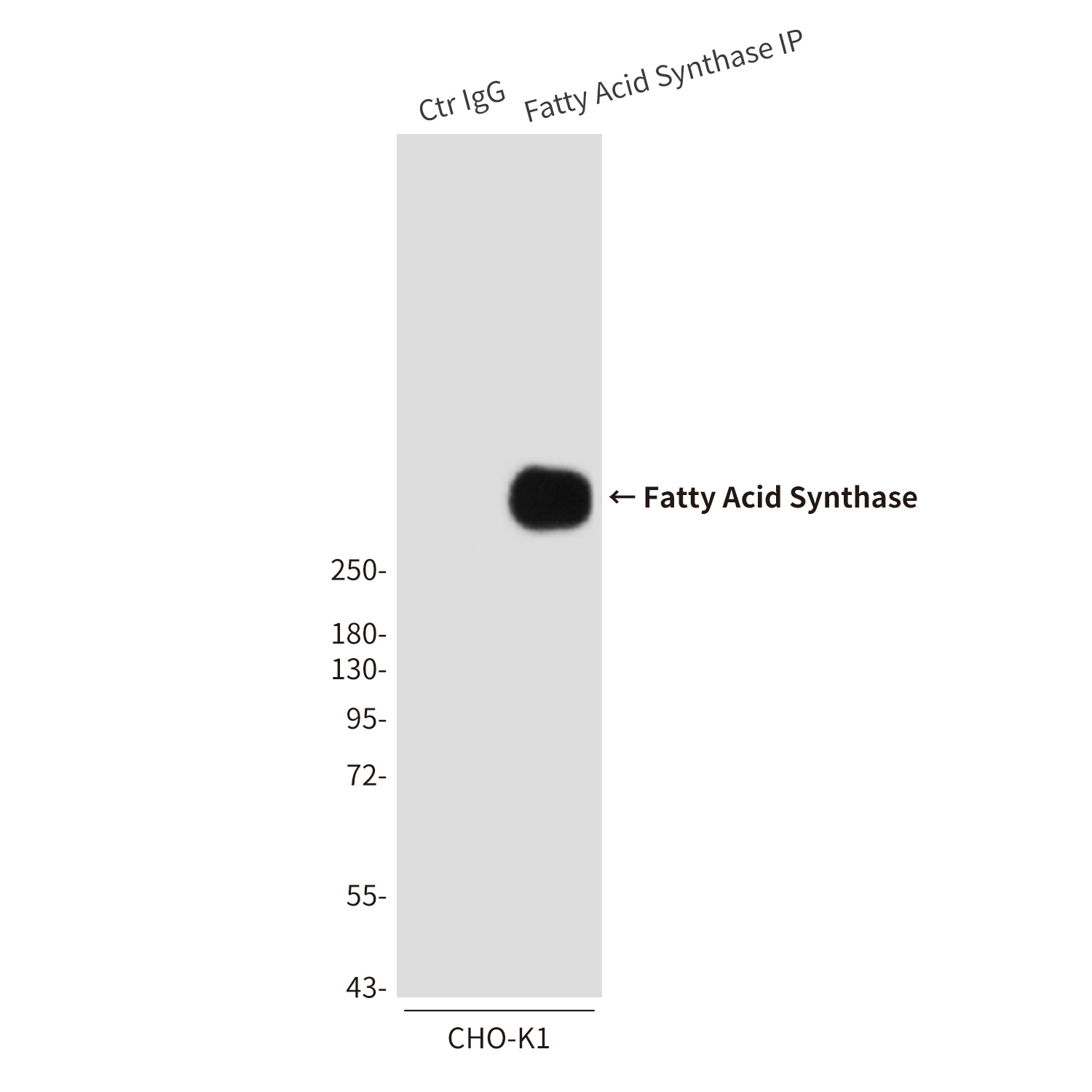 Immunoprecipitation analysis of Fatty Acid Synthase in CHO-K1 lysates using Fatty Acid Synthase antibody. |