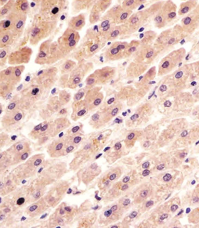 P32877 staining FER in human liver tissue sections by Immunohistochemistry (IHC-P – paraformaldehyde-fixed, paraffin-embedded sections). Tissue was fixed with formaldehyde and blocked with 3% BSA for 0. 5 hour at room temperature; antigen retrieval was by heat mediation with a citrate buffer (pH6). Samples were incubated with primary antibody (1/25) for 1 hours at 37°C. A undiluted biotinylated goat polyvalent antibody was used as the secondary antibody. |