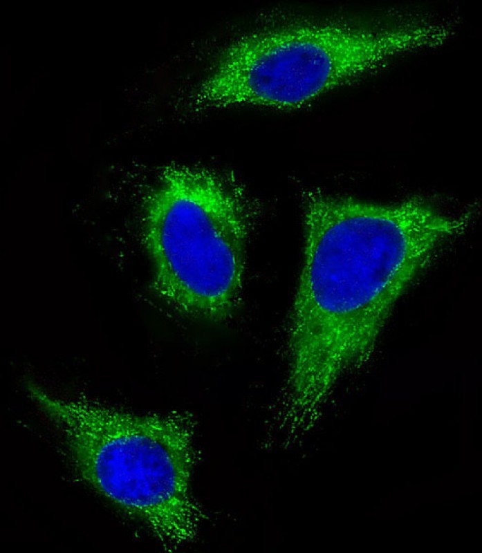 Immunofluorescent analysis of 4% paraformaldehyde-fixed, 0.1% Triton X-100 permeabilized HeLa (human cervical epithelial adenocarcinoma cell line) cells labeling FGFR1 with P32875 at 1/25 dilution, followed by Dylight® 488-conjugated goat anti-mouse IgG secondary antibody at 1/200 dilution (green). Immunofluorescence image showing cytoplasm staining on HeLa cell line. The nuclear counter stain is DAPI (blue). |