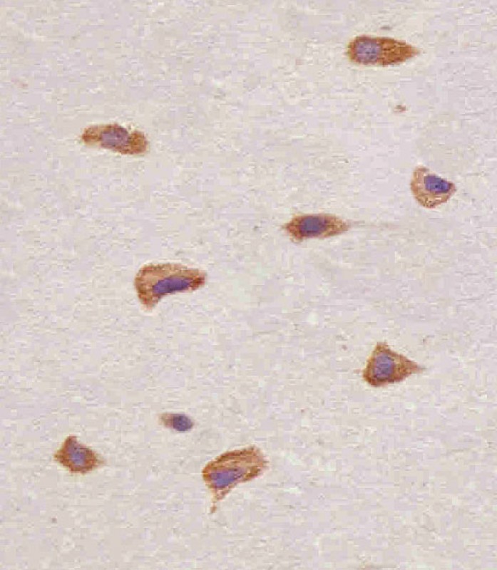 P32875 staining FGFR1 in human brain tissue sections by Immunohistochemistry (IHC-P – paraformaldehyde-fixed, paraffin-embedded sections). Tissue was fixed with formaldehyde and blocked with 3% BSA for 0. 5 hour at room temperature; antigen retrieval was by heat mediation with a citrate buffer (pH6). Samples were incubated with primary antibody (1/25) for 1 hours at 37°C. A undiluted biotinylated goat polyvalent antibody was used as the secondary antibody. |