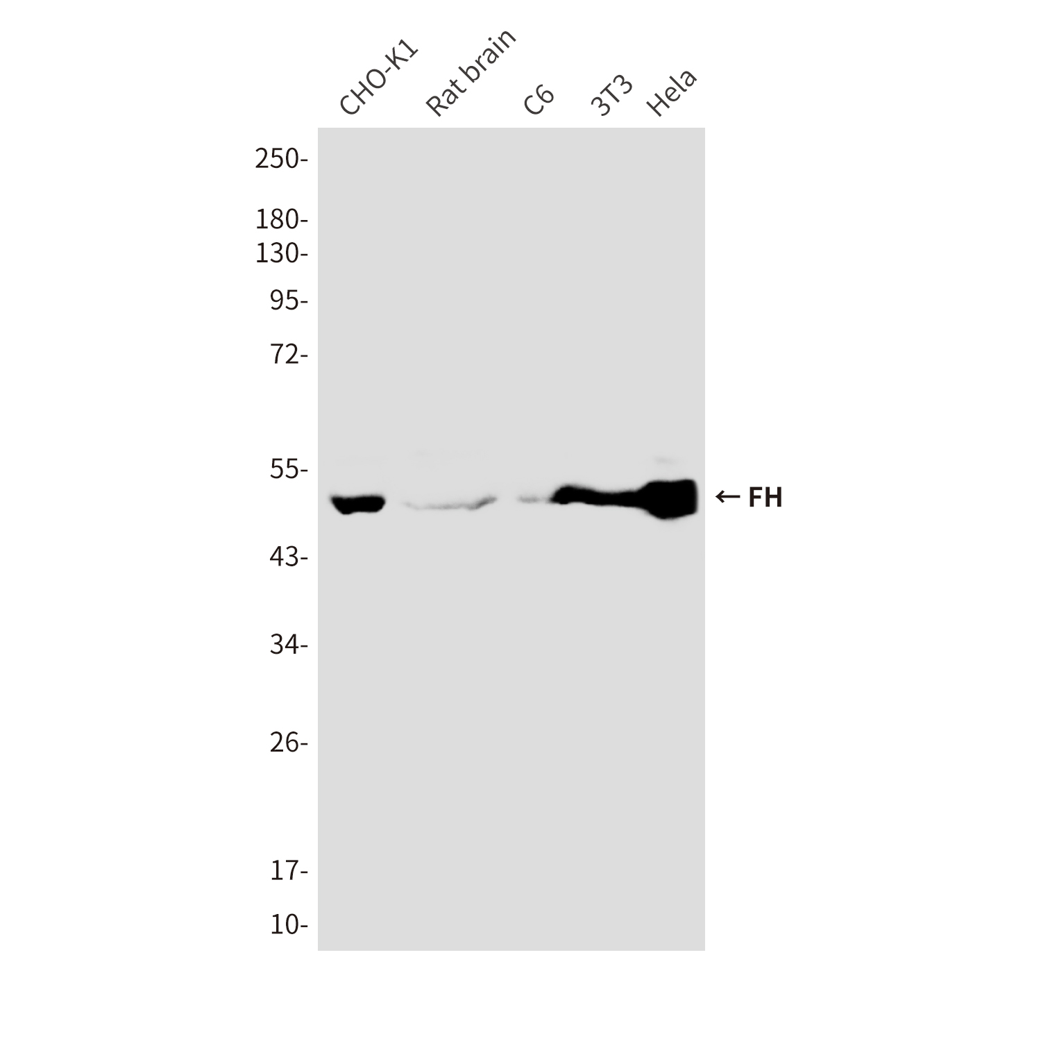 Western blot analysis of FH in CHO-K1, rat brain, C6, 3T3, Hela lysates using Fumarase antibody. |