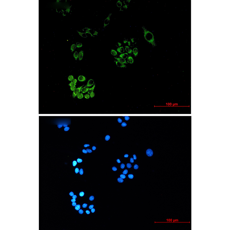 Immunocytochemistry analysis of FH/Fumarase (green) in Hela using FH/Fumarase antibody ,and DAPI(blue) |