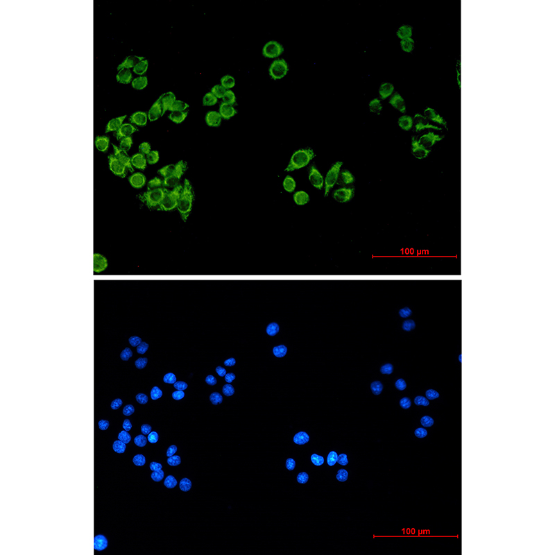 Immunocytochemistry analysis of FH/Fumarase (green) in Hela using FH/Fumarase antibody ,and DAPI(blue) |