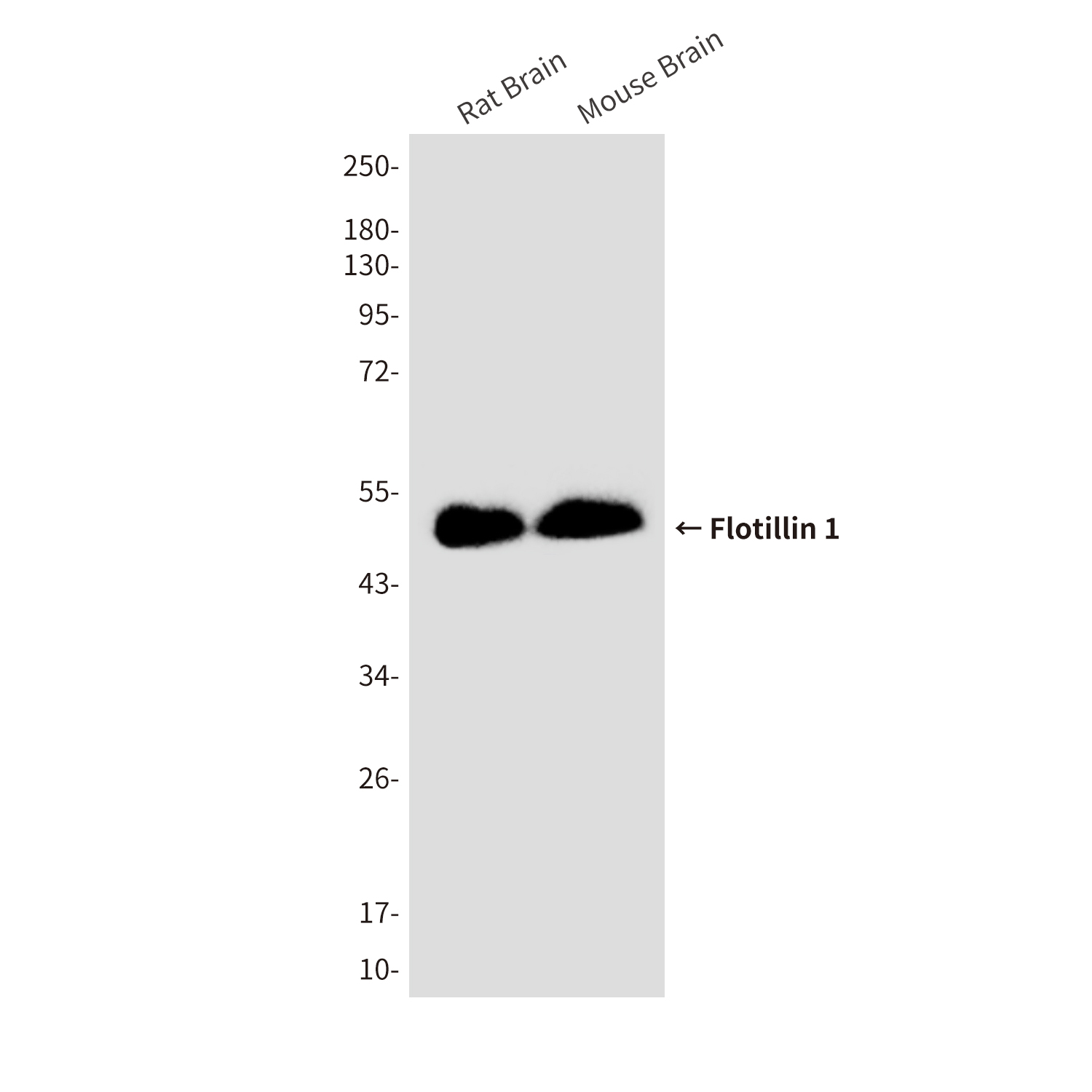 Western blot analysis of Flotillin 1 in mouse brain, rat brain lysates using Flotillin1 antibody. |