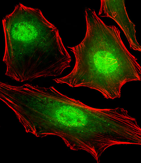 Fluorescent image of Hela cells stained with FUBP3 Antibody (N-term)(Cat#P32532). P32532 was diluted at 1:25 dilution. An Alexa Fluor® 488-conjugated goat anti-mouse lgG at 1:400 dilution was used as the secondary antibody (green). Cytoplasmic actin was counterstained with Alexa Fluor® 555 conjugated with Phalloidin (red). |