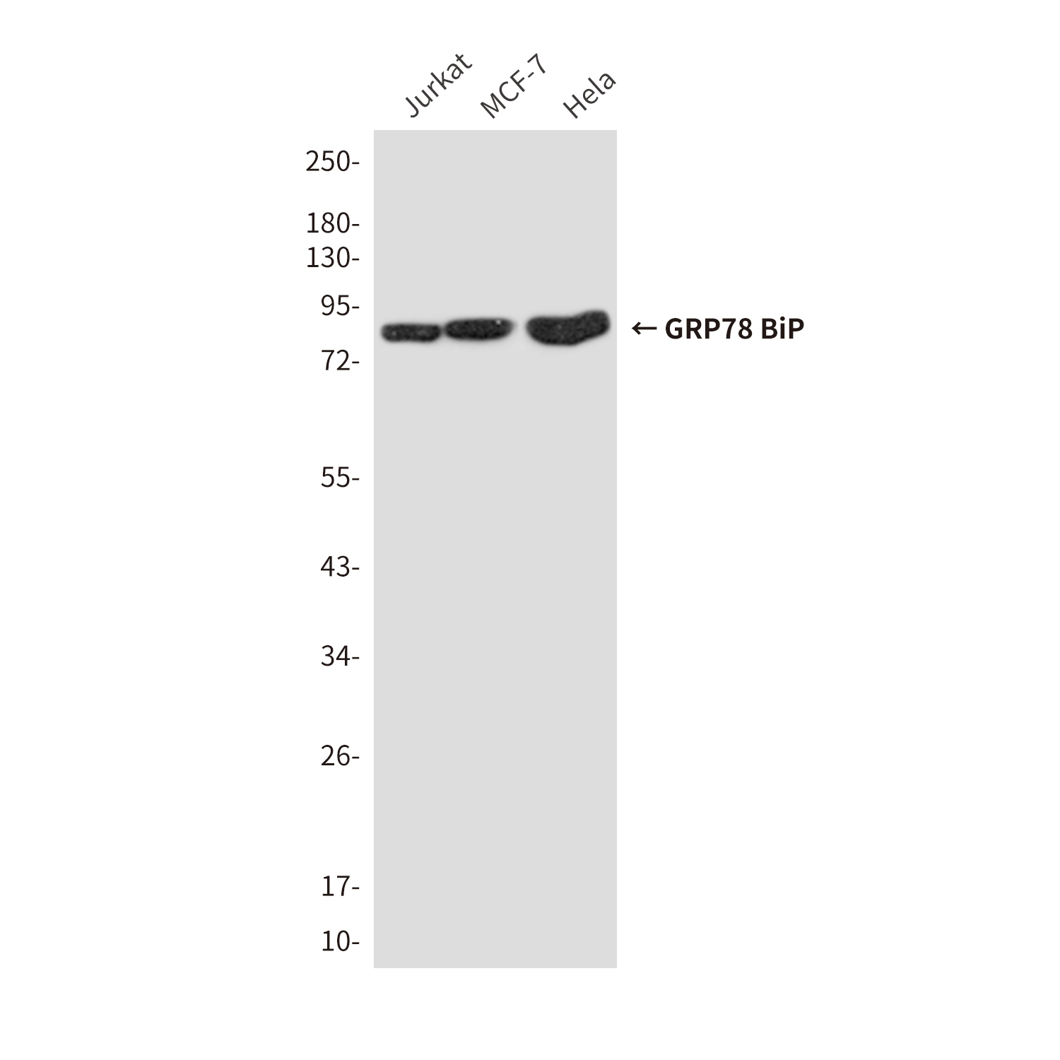 Western blot analysis of GRP78 BiP in Jurkat, MCF-7, Hela lysates using GRP78 BiP antibody |