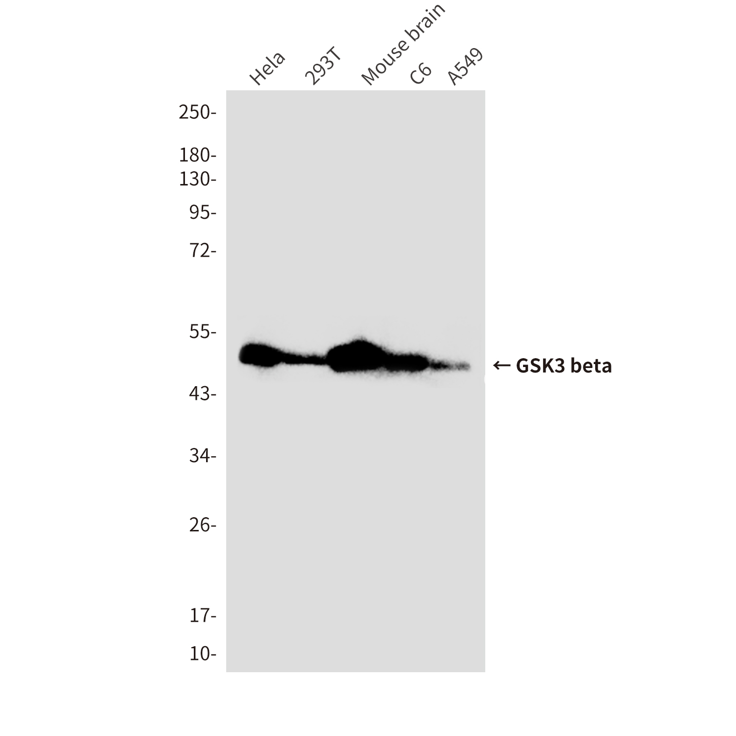 Western blot analysis of GSK3 beta in Hela, 293T, mouse brain, C6, A549 lysates using GSK3 beta antibody. |