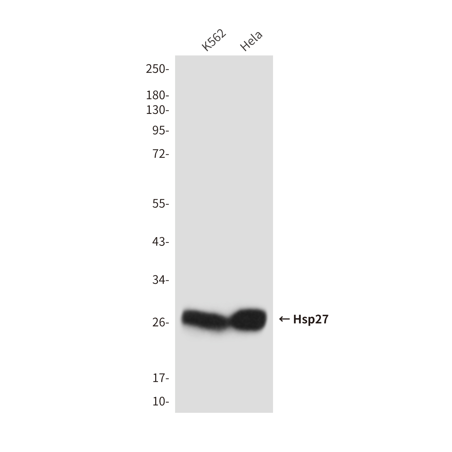 Western blot analysis of Hsp27 in K562, Hela lysates using HSP27 antibody. |