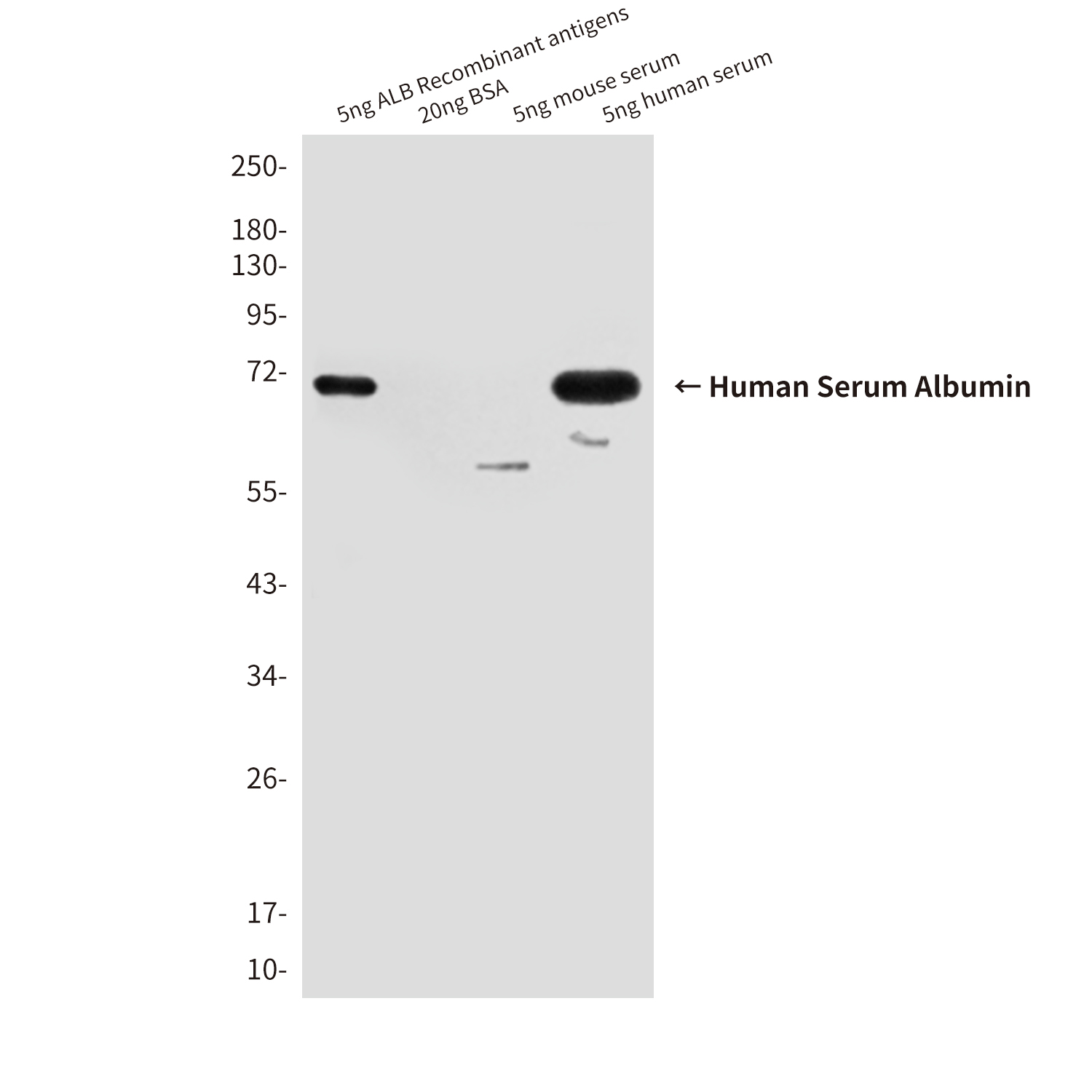 Western blot analysis of Human Serum Albumin in 0.5nl Human serum and 5ng ALB Recombinant antigens lysates using Human Serum Albumin antibody. |