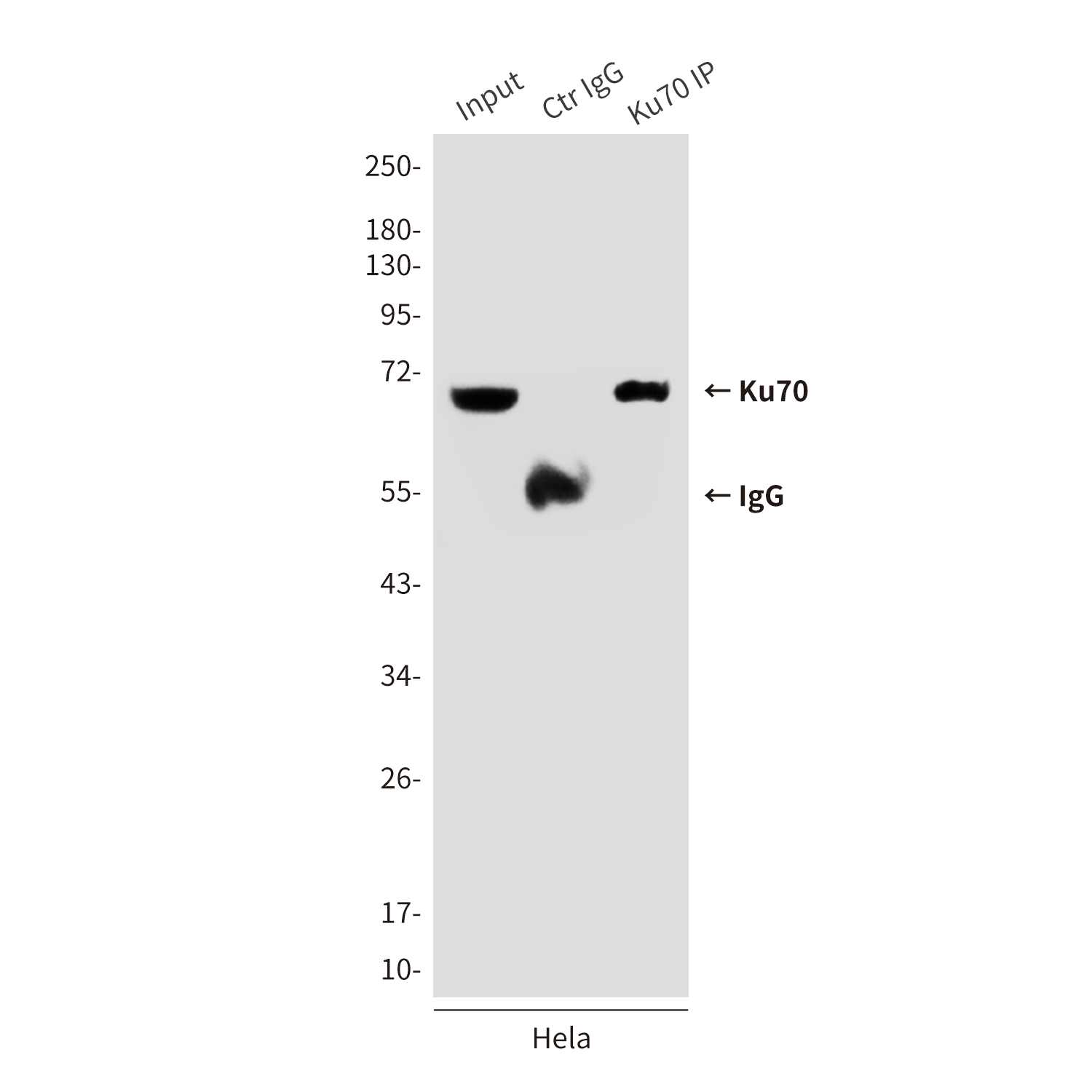 Immunoprecipitation analysis of Ku70 in Hela lysates using Ku7 antibody. |