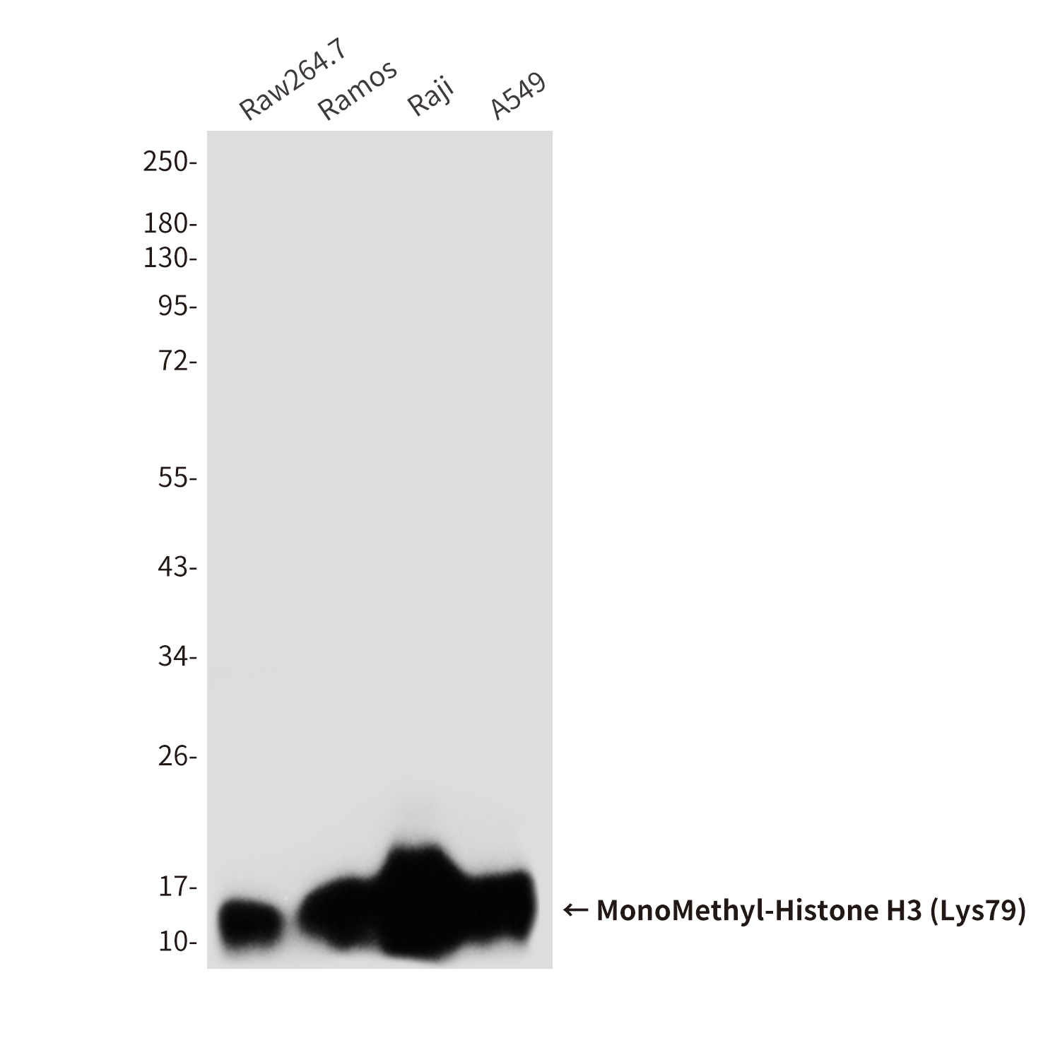 Western blot analysis of MonoMethyl-Histone H3 (Lys79) in Raw264.7, Ramos, Raji, A549 lysates using MonoMethyl-Histone H3 (Lys79) antibody. |