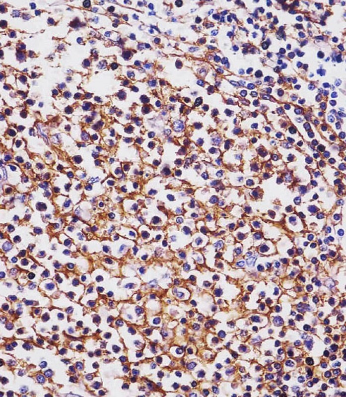 Immunohistochemical analysis of paraffin-embedded Human tonsil section using Pink1(Cat#P31691). P31691 was diluted at 1:1000 dilution. A undiluted biotinylated goat polyvalent antibody was used as the secondary, followed by DAB staining. |