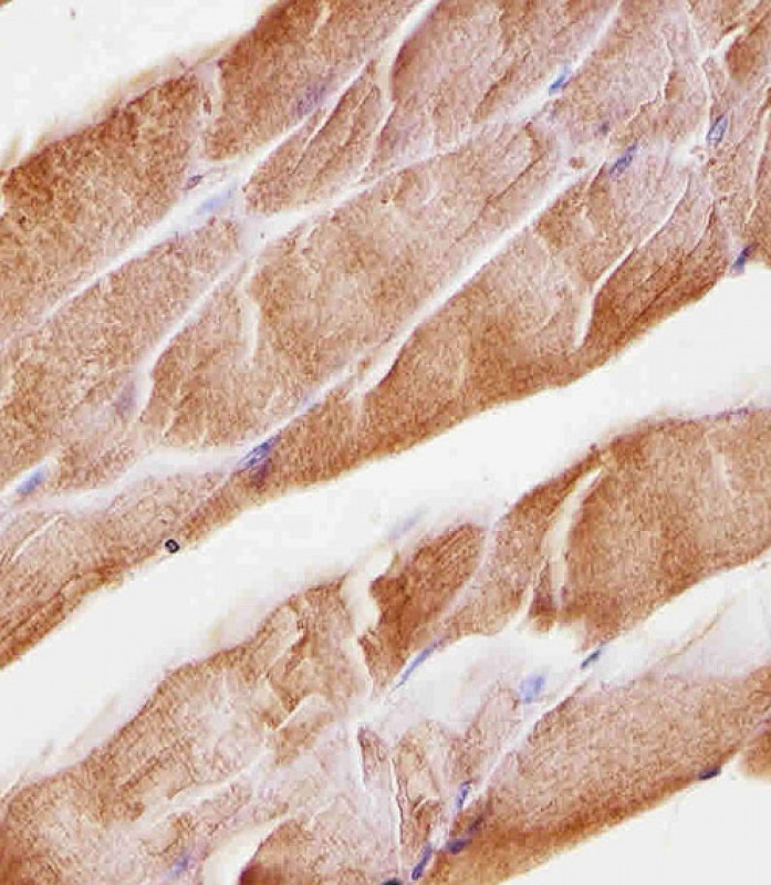 Immunohistochemical analysis of paraffin-embedded M. skeletal muscle section using Musk Antibody(Cat#P32872). P32872 was diluted at 1:25 dilution. A undiluted biotinylated goat polyvalent antibody was used as the secondary, followed by DAB staining. |