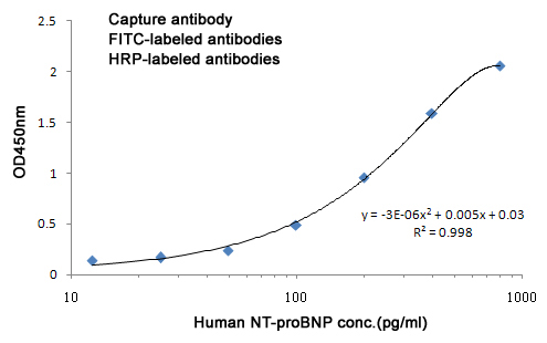 sELISA standard Curve for NTproBNP: Capture Antibody mouse mAb (2012893C9) to NTproBNP and Detector Antibody mouse mAb(2012891B5) to NTproBNP. |