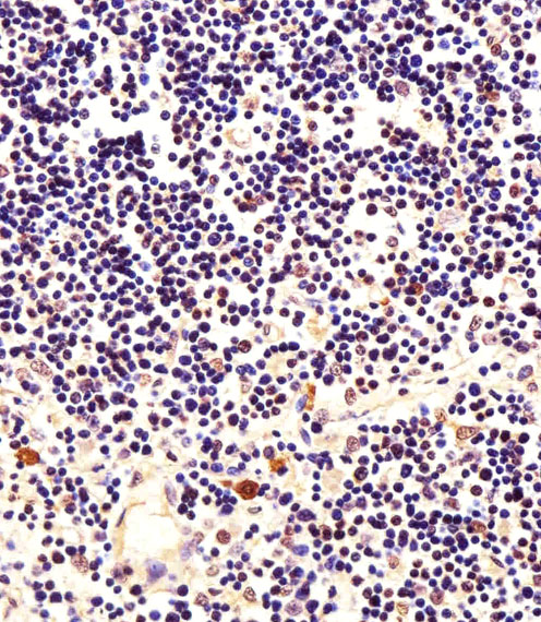 Immunohistochemical analysis of paraffin-embedded H. thymus section using NPM1 Antibody(Cat#P32491). P32491 was diluted at 1:25 dilution. A undiluted biotinylated goat polyvalent antibody was used as the secondary, followed by DAB staining. |
