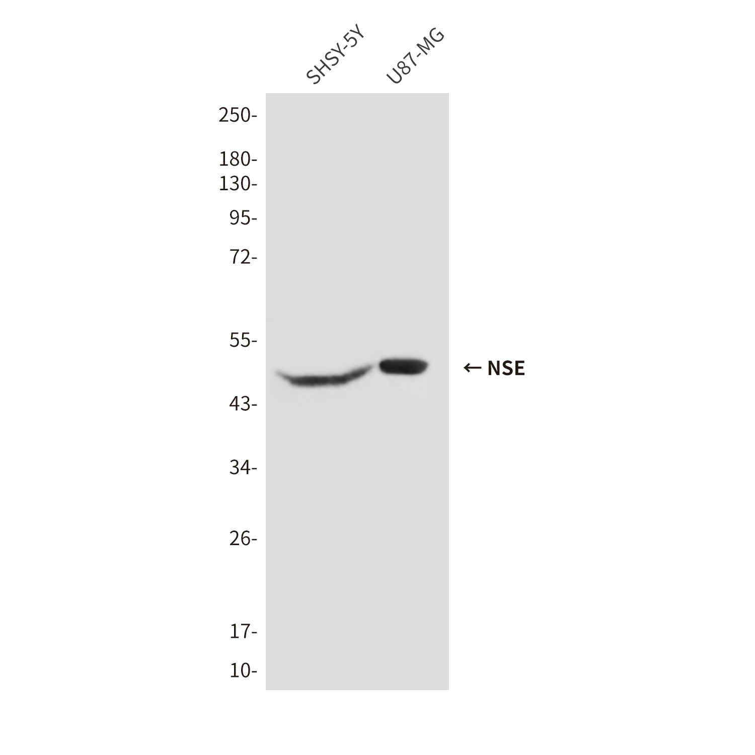 Western blot analysis of Enolase2 in SH-SY5Y and U87-MG lysates using Enolase2 antibody. |