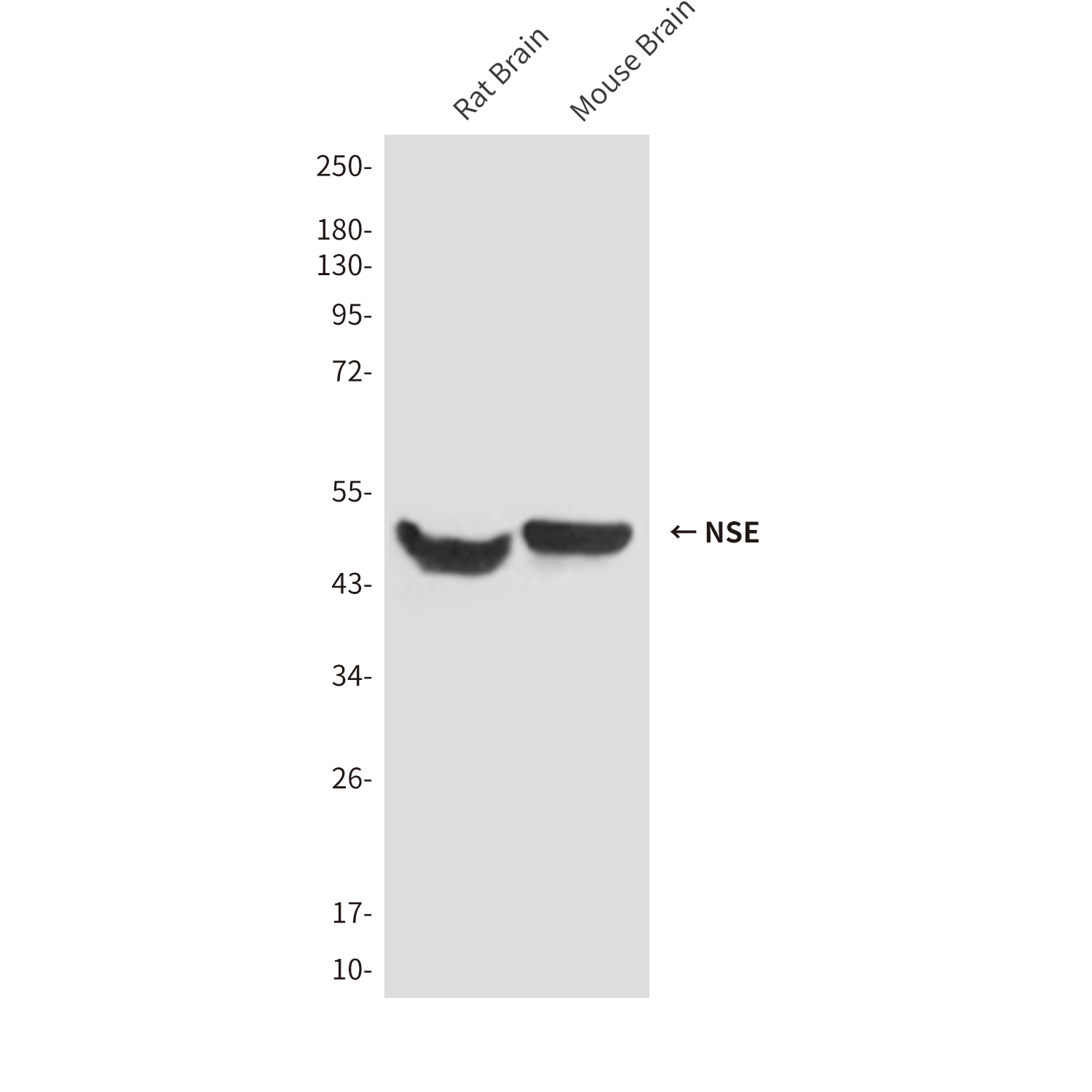 Western blot analysis of NSE in rat Brain and mouse Brain lysates using Enolase2 antibody. |