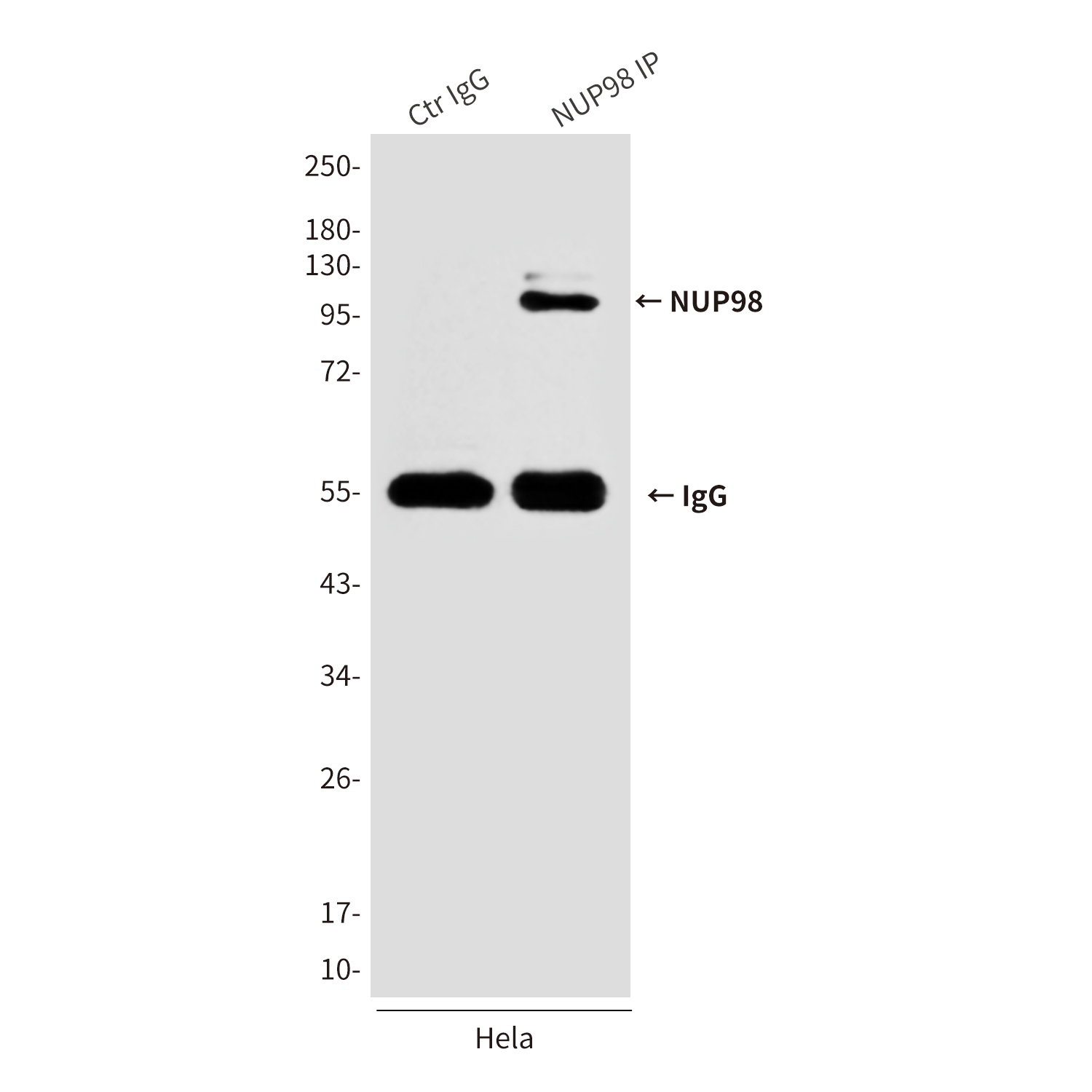 Immunoprecipitation analysis of NUP98 in Hela lysates using NUP98 antibody. |