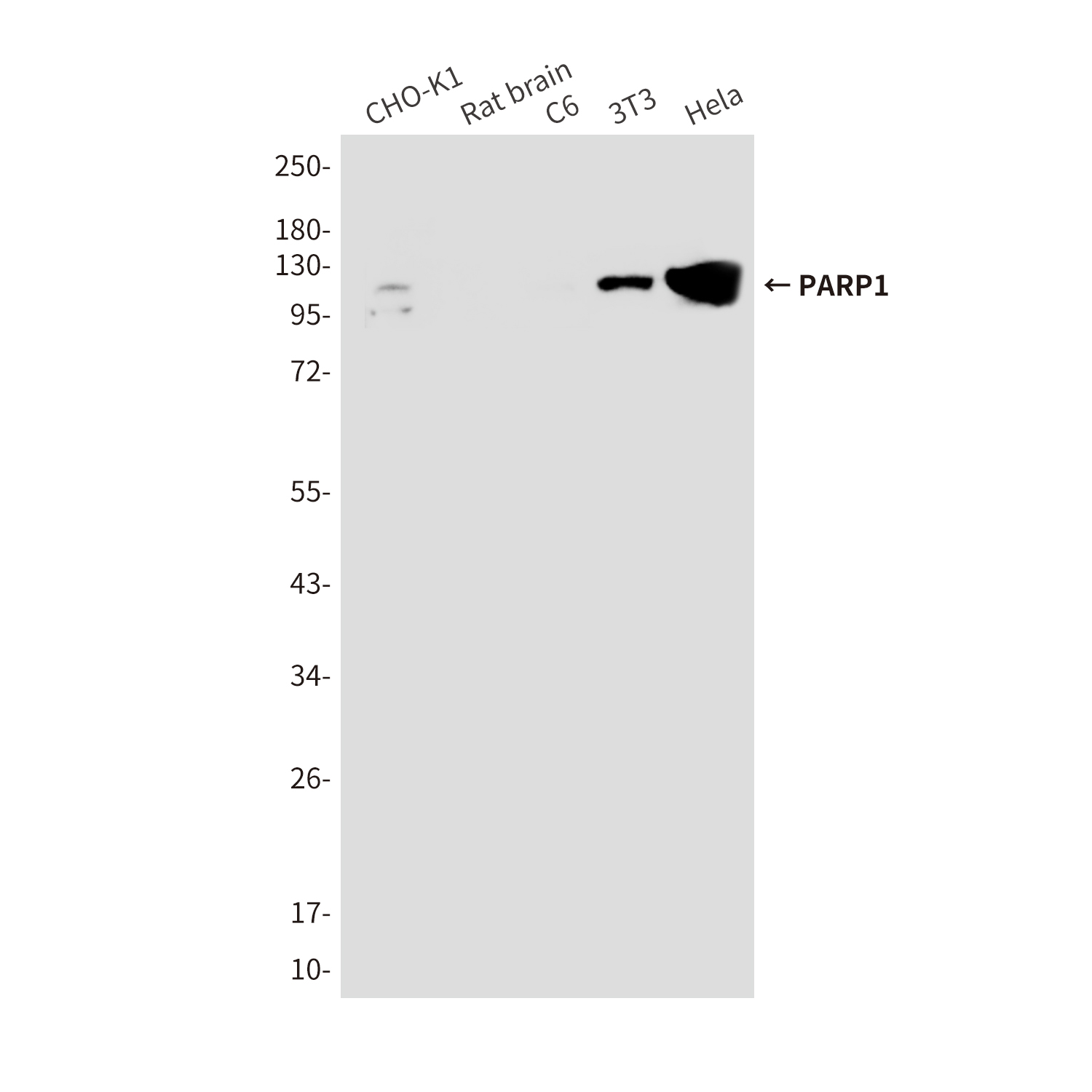 Western blot analysis of PARP1 in CHO-K1, rat brain, C6, 3T3, Hela lysates using PARP antibody. |