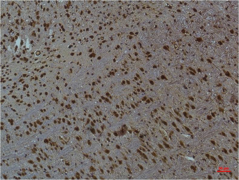 Immunohistochemistry analysis of paraffin-embedded rat Brain Tissue using Phospho-CaMKII (Thr287) antibody.High-pressure and temperature Sodium Citrate pH 6.0 was used for antigen retrieval. |