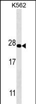 PSMA5 Antibody (Cat. #P33306) western blot analysis in K562 cell line lysates (35μg/lane).This demonstrates the PSMA5 antibody detected the PSMA5 protein (arrow). |