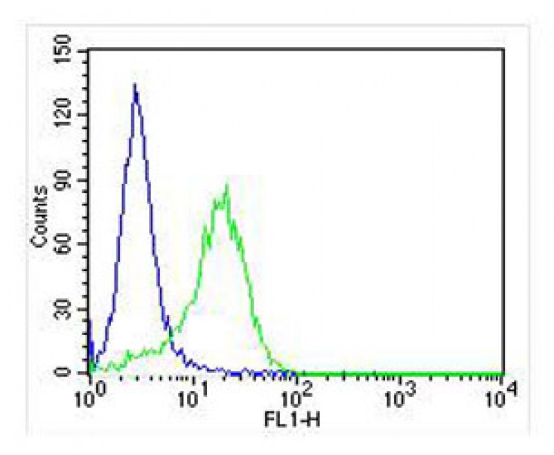 Overlay histogram showing PC-12 cells stained with P33311 (green line). The cells were fixed with 2% paraformaldehyde (10 min) and then permeabilized with 90% methanol for 10 min. The cells were then icubated in 2% bovine serum albumin to block non-specific protein-protein interactions followed by the antibody (P33311, 1:25 dilution) for 60 min at 37ºC. The secondary antibody used was Goat-Anti-Mouse IgG, DyLight® 488 Conjugated Highly Cross-Adsorbed(NA168821)) at 1/400 dilution for 40 min at 37ºC. Isotype control antibody (blue line) was mouse IgG (1μg/1×10^6 cells) used under the same conditions. Acquisition of >10, 000 events was performed. |