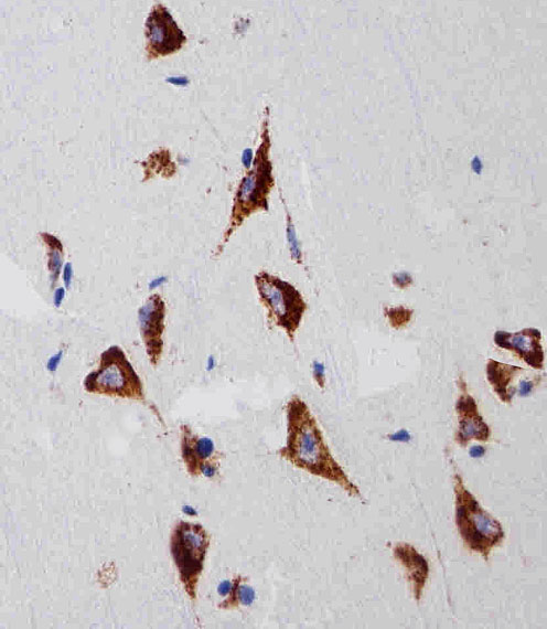Immunohistochemical analysis of paraffin-embedded H. brain section using RPS6 Antibody (N-term)(Cat#P32631). P32631 was diluted at 1:25 dilution. A peroxidase-conjugated goat anti-mouse IgG at 1:400 dilution was used as the secondary antibody, followed by DAB staining. |