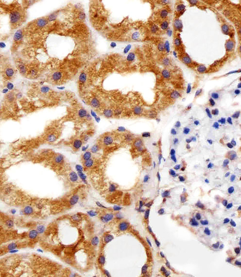 Immunohistochemical analysis of paraffin-embedded H. kidney section using RPS6 Antibody (N-term)(Cat#P32631). P32631 was diluted at 1:25 dilution. A peroxidase-conjugated goat anti-mouse IgG at 1:400 dilution was used as the secondary antibody, followed by DAB staining. |