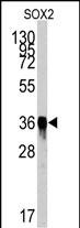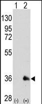 Western blot analysis of SOX2 (arrow) using mouse monoclonal SOX2 antibody (Cat.#P32871). 293 cell lysates (2 μg/lane) either nontransfected (Lane 1) or transiently transfected with the SOX2 gene (Lane 2) (Origene Technologies) |