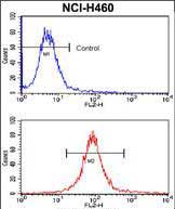 Flow cytometric analysis of NCI-H460 cells using SOX2 Monoclonal Antibody (bottom histogram) compared to a negative control cell (top histogram). PE-conjugated goat-anti-mouse secondary antibodies were used for the analysis. |
