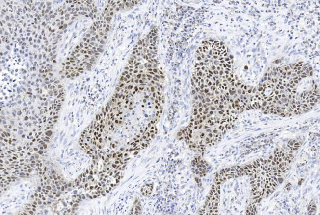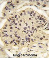 Formalin-fixed and paraffin-embedded human lung carcinoma tissue reacted with SOX2 Antibody (Cat.#P32871), which was peroxidase-conjugated to the secondary antibody, followed by DAB staining. This data demonstrates the use of this antibody for immunohistochemistry; clinical relevance has not been evaluated. |