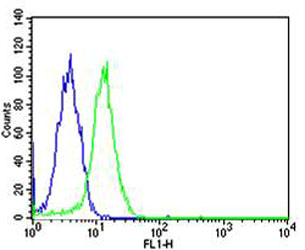 Flow cytometric analysis of Hela cells using SP1 Antibody(green, Cat#P32591) compared to an isotype control of mouse IgG1(blue). P32591 was diluted at 1:25 dilution. An Alexa Fluor® 488 goat anti-mouse lgG at 1:400 dilution was used as the secondary antibody. |