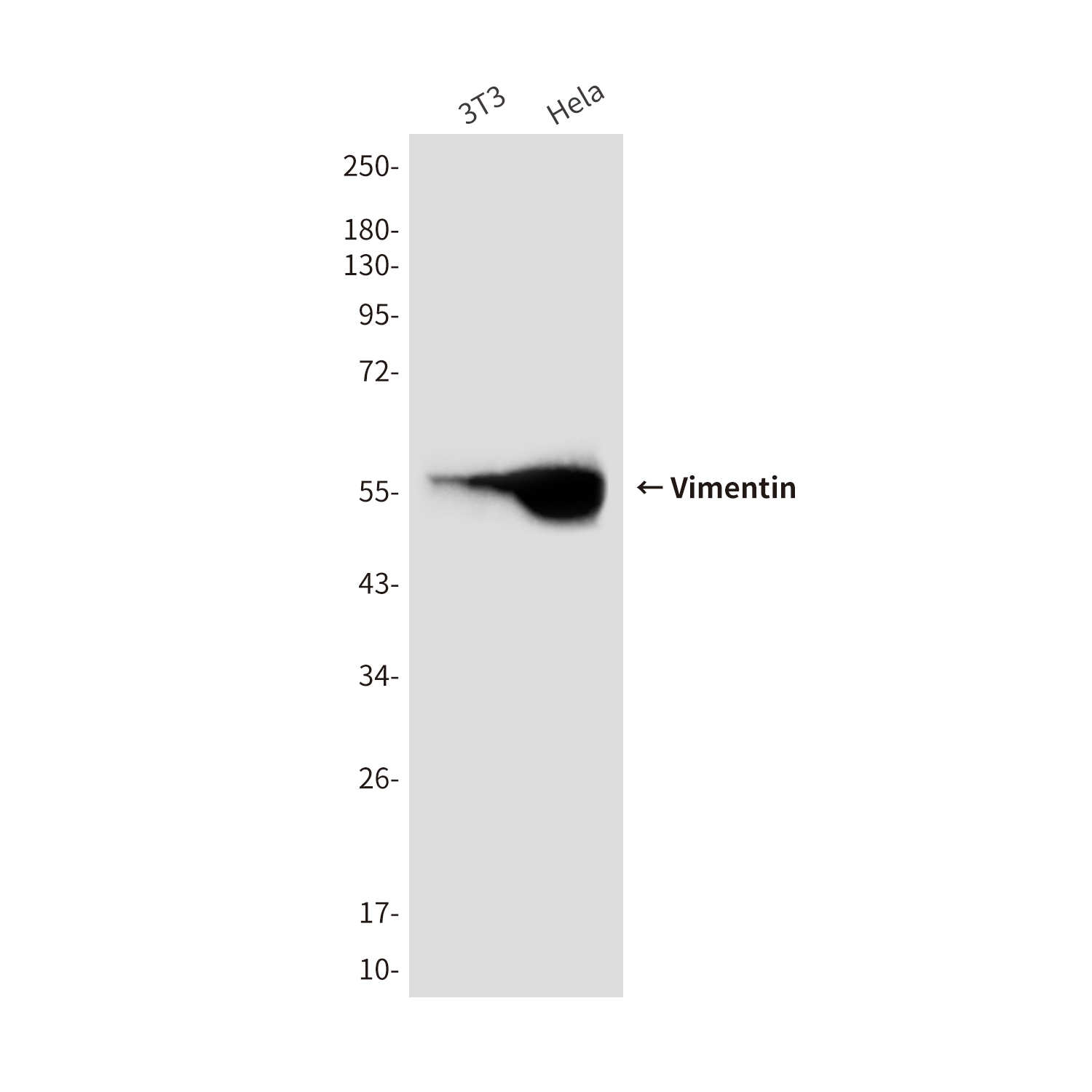 Western blot analysis of Vimentin in 3T3, Hela lysates using Vimentin antibody. |