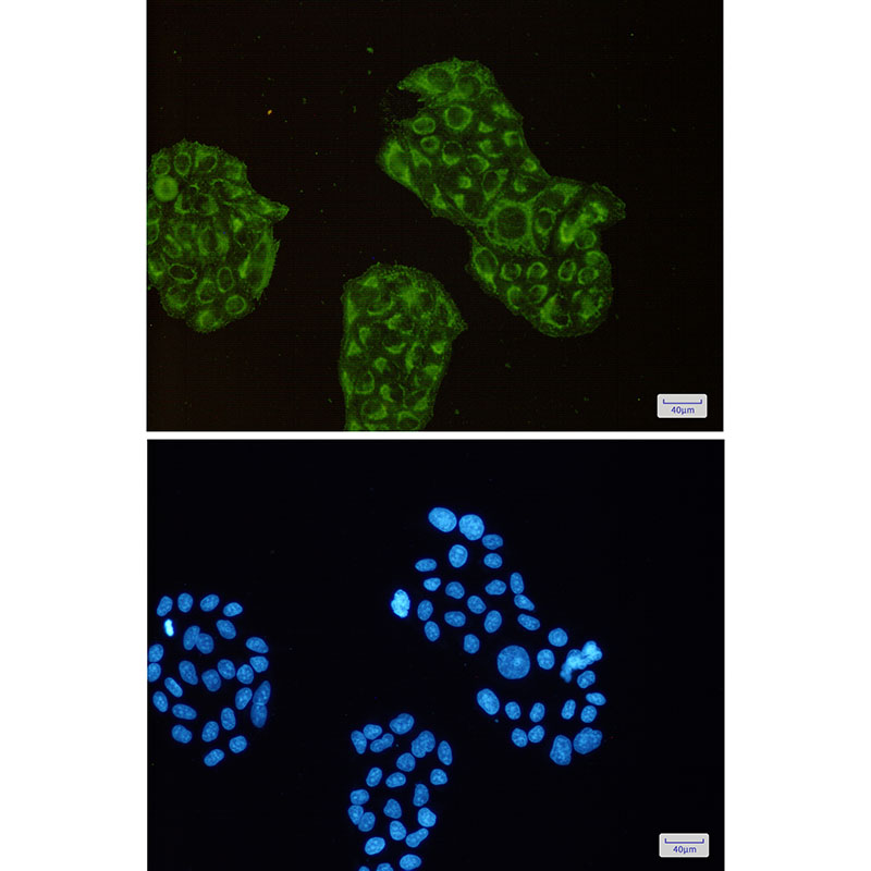 Immunocytochemistry analysis of ACADM(green) in Hela using ACADM antibody,and DAPI(blue) |